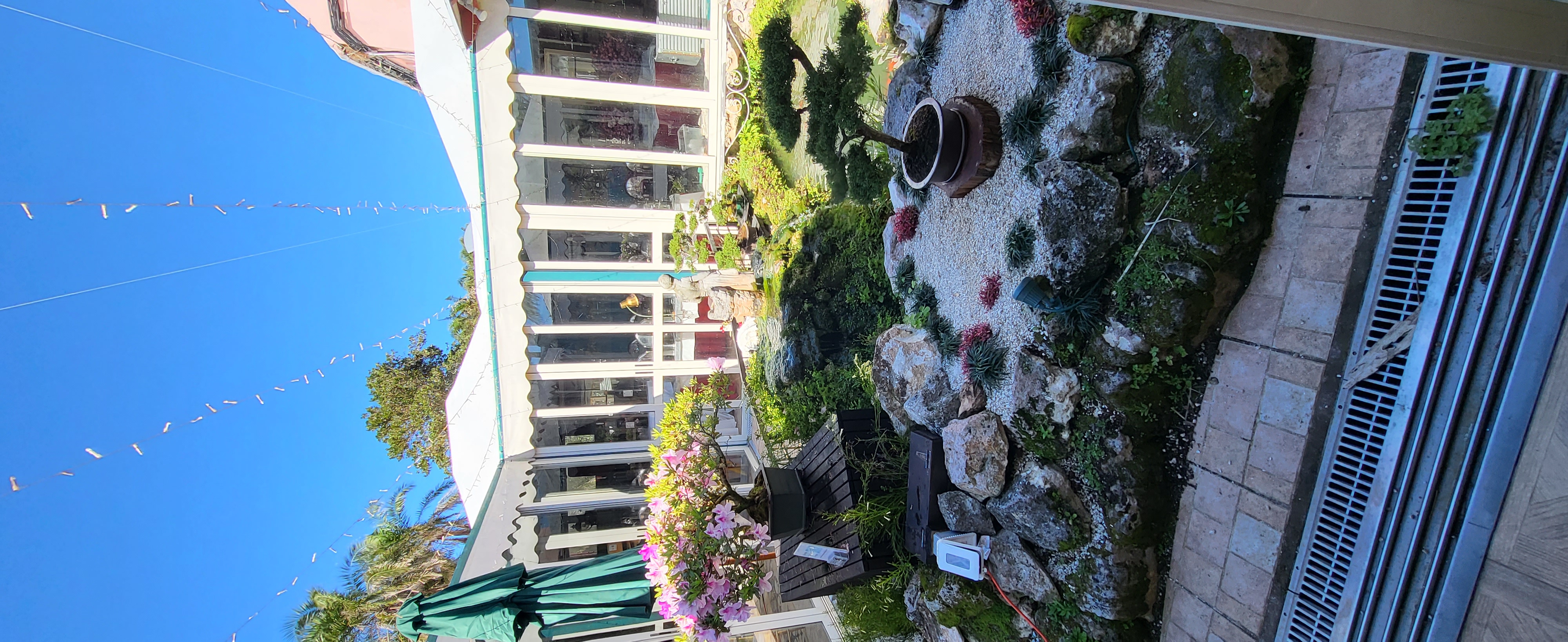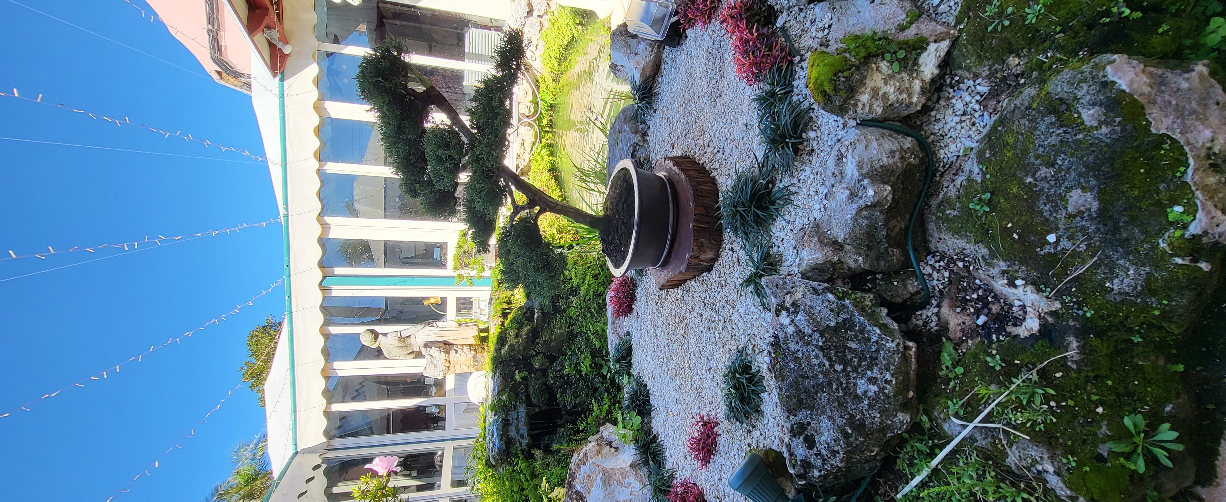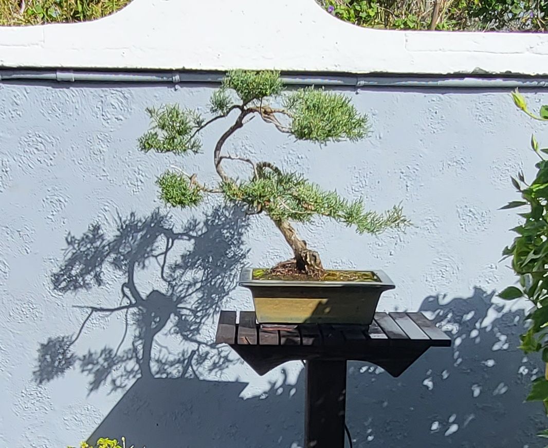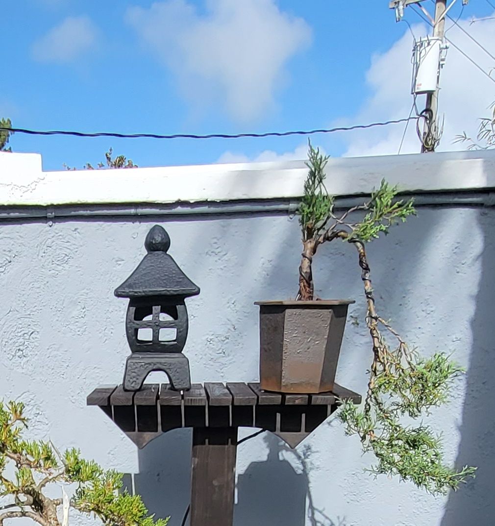 The main objective was to clear the area of the overgrowing Mondo grass and add a Bonsai or two however, the pond water was pea green, it hadn't been clear in 20 years. So, the first job was to clear the water. I changed the filters and pumps, added UV clarifiers and today, it is so clear, you can see the bottom! The Mondo grass was removed and a higher rockery was built. The filters were hidden with a removable wooden enclosure. A bespoke Japanese fence was made and installed on the north side to protect the Bonsai from wandering hands, and planters were constructed to replace the old pots that were loitering around the edge of the pond. 3 Bonsai on stands sit alongside the pond edge on the north side, a single Bonsai stands on top of a Bermuda Cedar slice and a Bonsai is situated on top of the filter enclosure