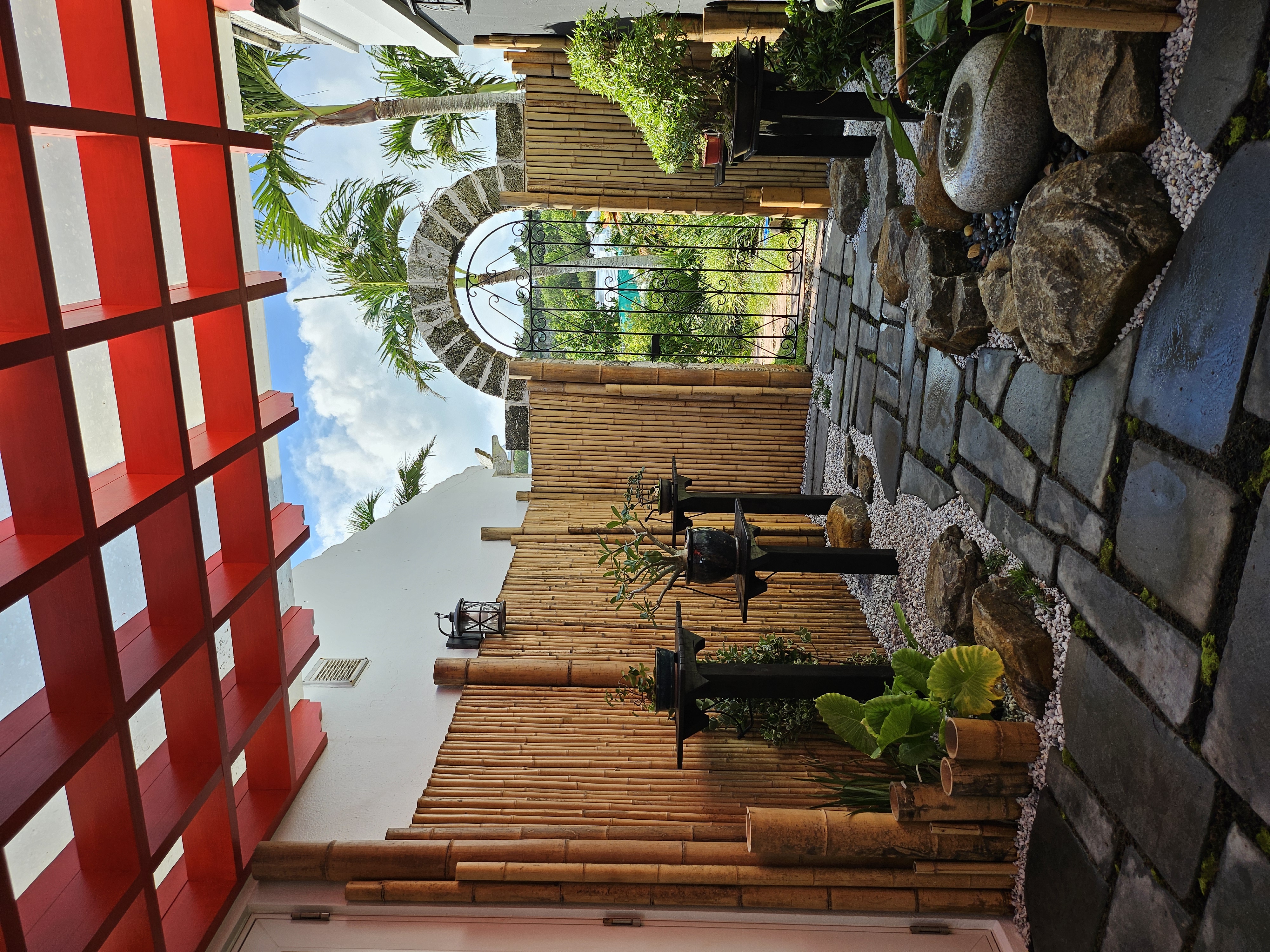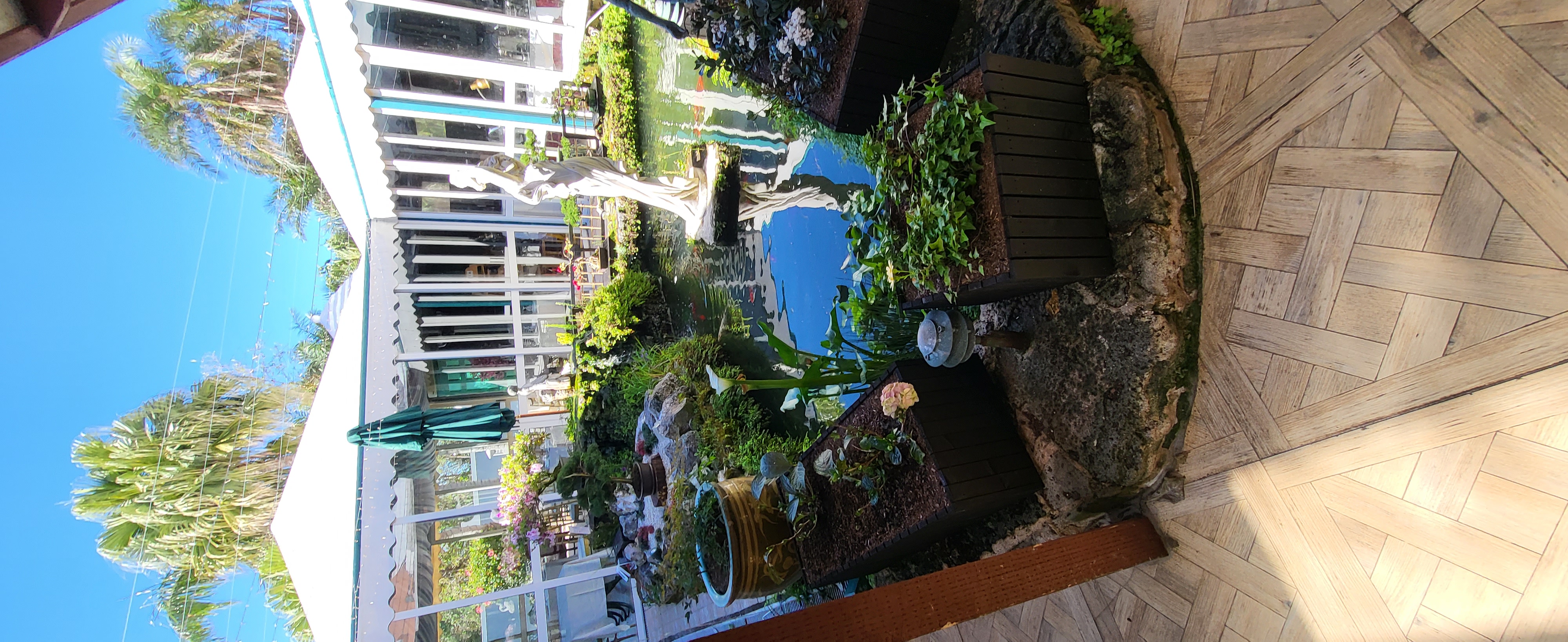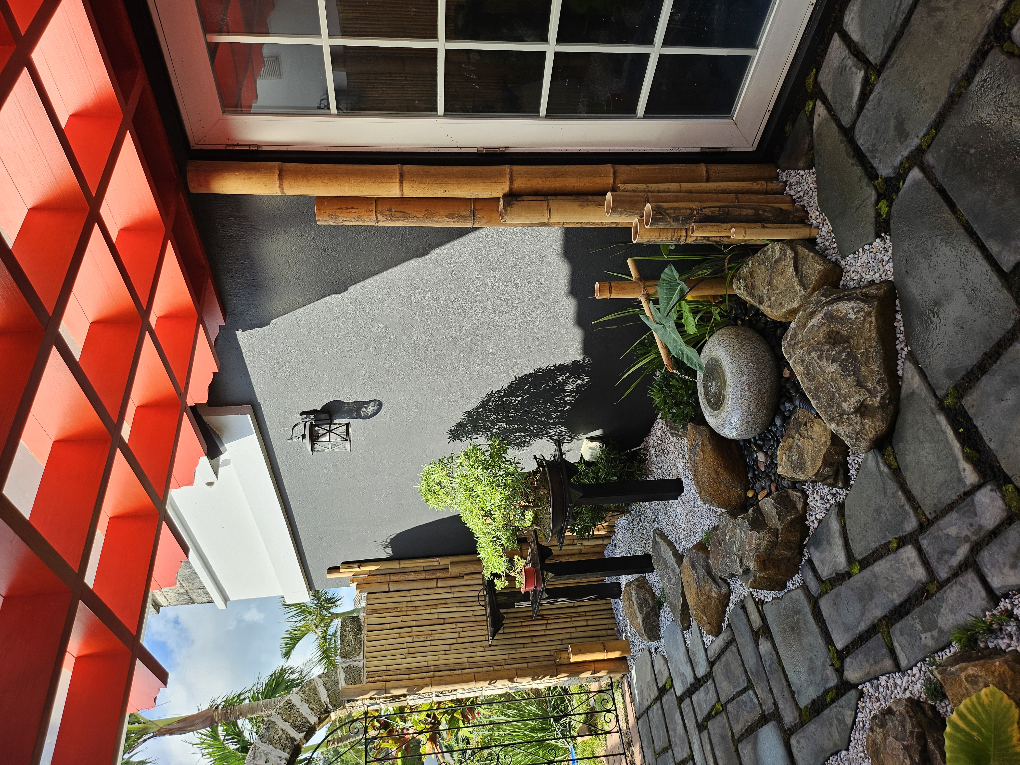 The main objective was to clear the area of the overgrowing Mondo grass and add a Bonsai or two however, the pond water was pea green, it hadn't been clear in 20 years. So, the first job was to clear the water. I changed the filters and pumps, added UV clarifiers and today, it is so clear, you can see the bottom! The Mondo grass was removed and a higher rockery was built. The filters were hidden with a removable wooden enclosure. A bespoke Japanese fence was made and installed on the north side to protect the Bonsai from wandering hands, and planters were constructed to replace the old pots that were loitering around the edge of the pond. 3 Bonsai on stands sit alongside the pond edge on the north side, a single Bonsai stands on top of a Bermuda Cedar slice and a Bonsai is situated on top of the filter enclosure