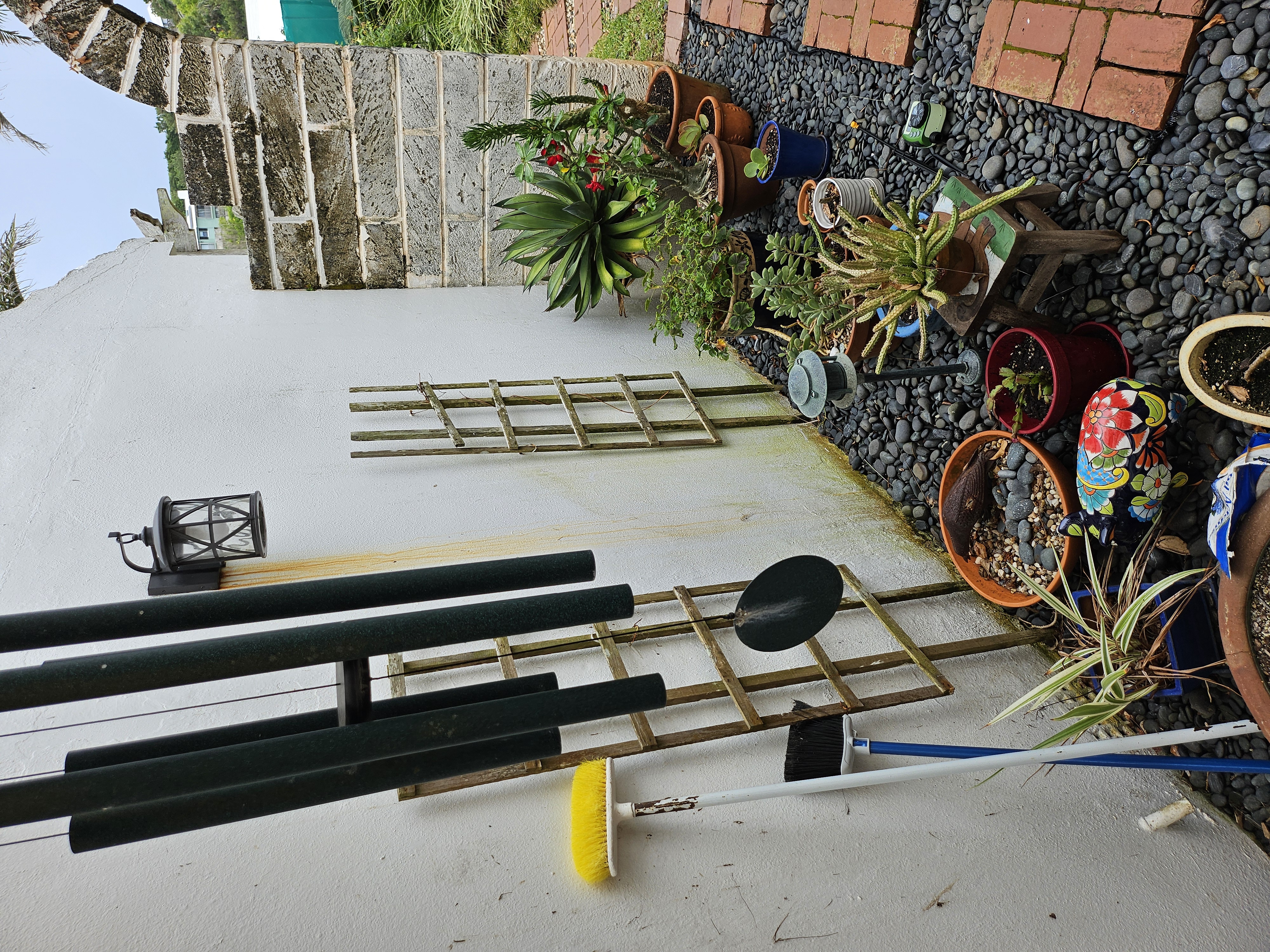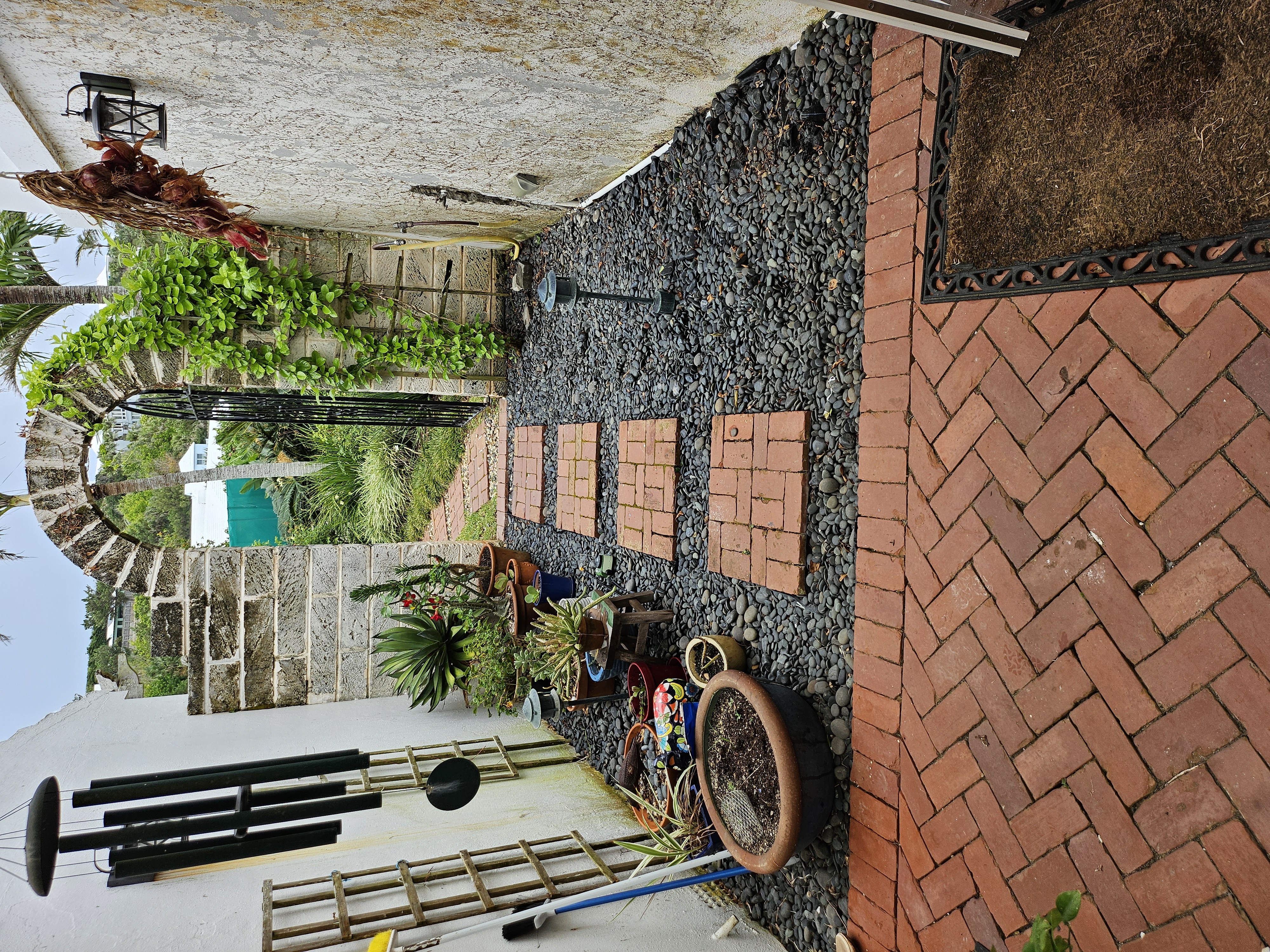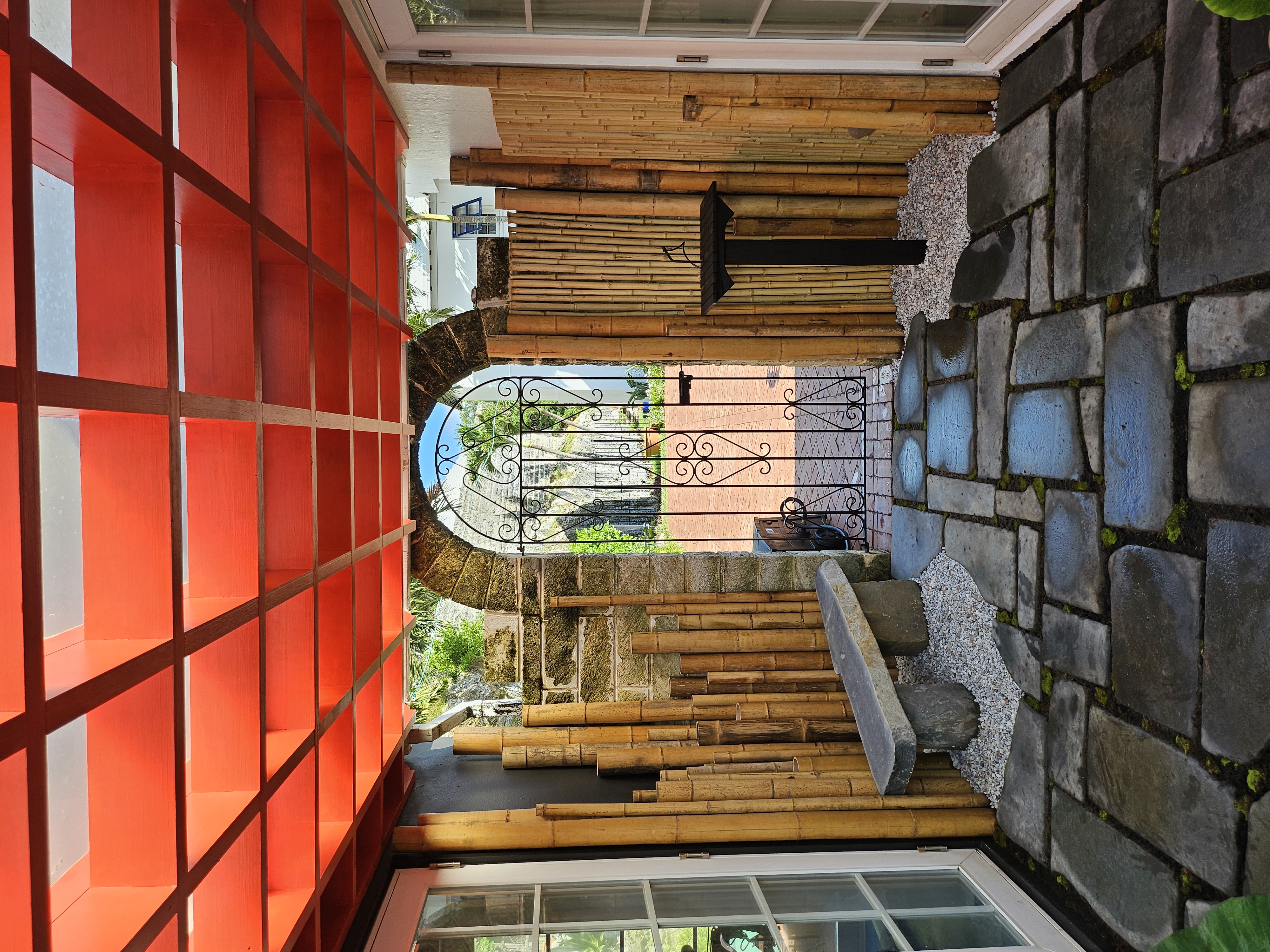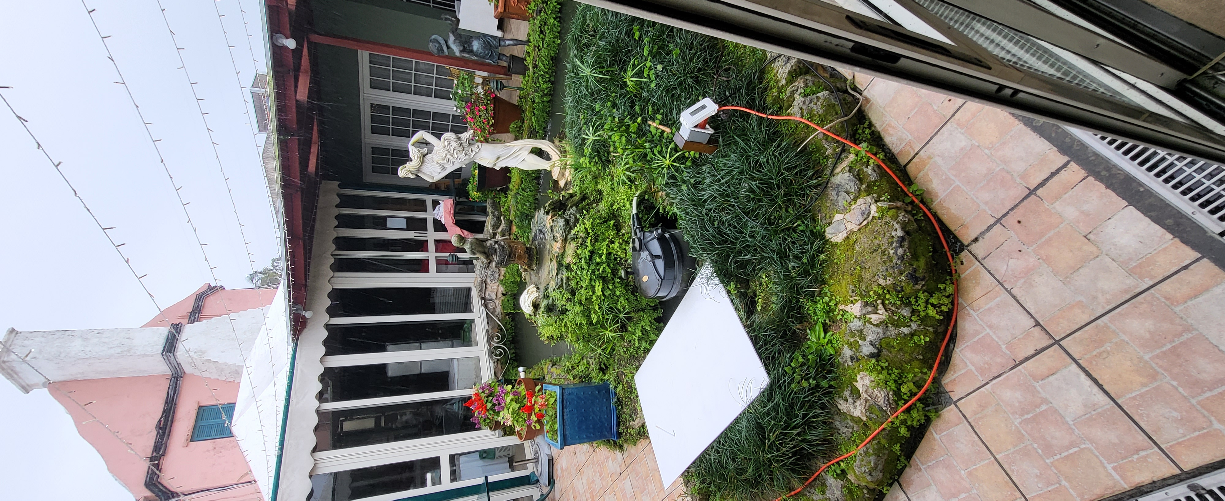 The main objective was to clear the area of the overgrowing Mondo grass and add a Bonsai or two however, the pond water was pea green, it hadn't been clear in 20 years. So, the first job was to clear the water. I changed the filters and pumps, added UV clarifiers and today, it is so clear, you can see the bottom! The Mondo grass was removed and a higher rockery was built. The filters were hidden with a removable wooden enclosure. A bespoke Japanese fence was made and installed on the north side to protect the Bonsai from wandering hands, and planters were constructed to replace the old pots that were loitering around the edge of the pond. 3 Bonsai on stands sit alongside the pond edge on the north side, a single Bonsai stands on top of a Bermuda Cedar slice and a Bonsai is situated on top of the filter enclosure