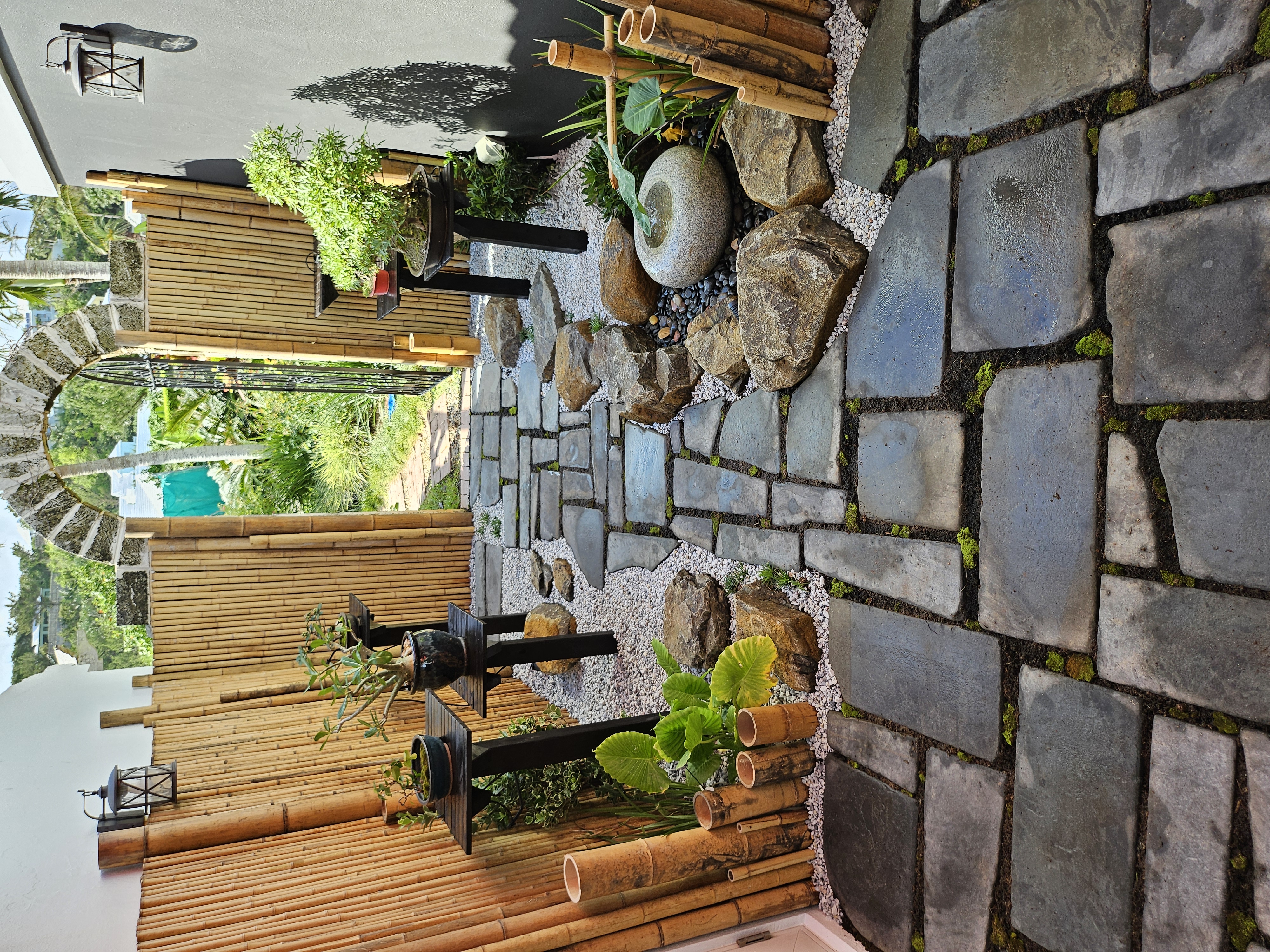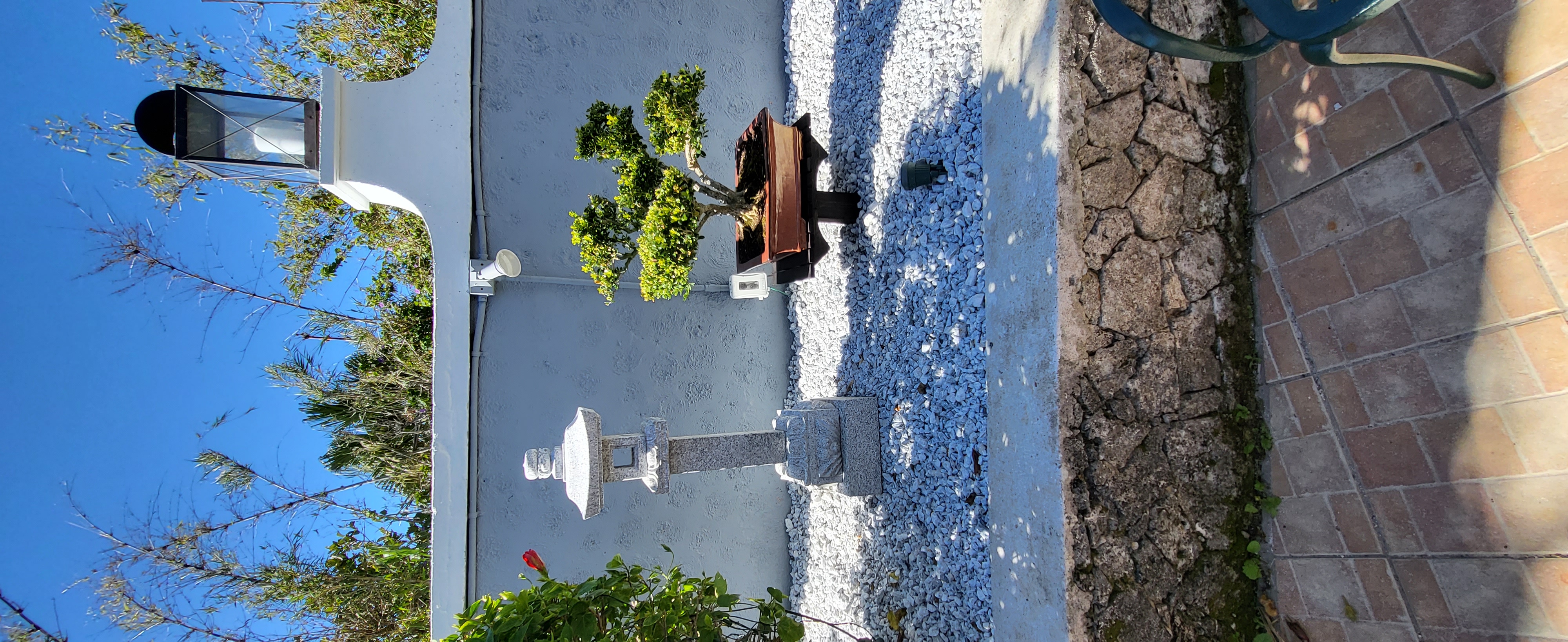 This walled garden was overgrown and tired. The space was not being used and it was time for a change. After completing the Koi Pond area, General Manager Andy, asked me for some ideas for the back walled garden....... The Bonsai Garden was born. This garden features award winning Bonsai, handmade Bonsai stands, solid granite Japanese lantern posts, Sanjuno-To Pagoda, Nishino lantern and a traditional Tetsu Bachi Basin. Marble gravel calms the entire space, while rocks and planting contrast the incredible central Bonsai display.